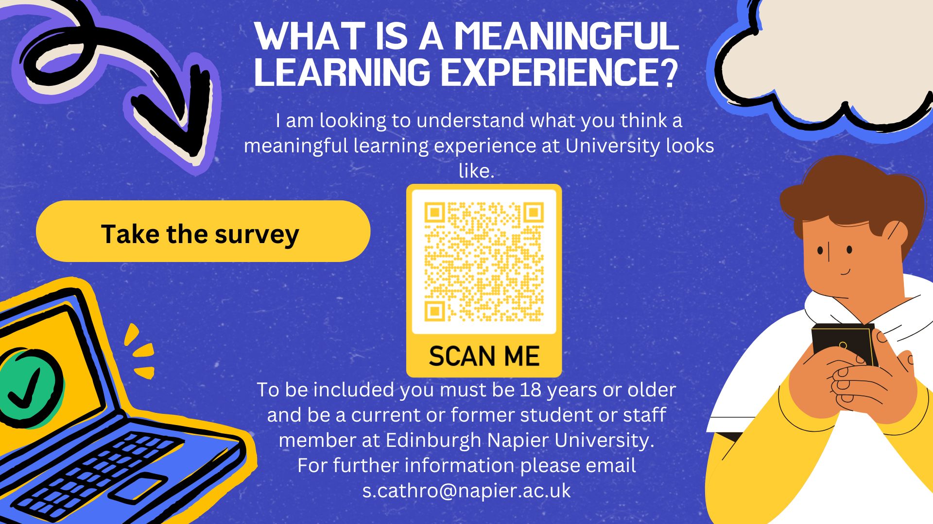 Postgraduate student Suzi Cathro is conducting a survey to better understand what makes university life meaningful for a variety of students as part of her PhD study into using mixed reality to create meaningful learning experiences within higher education. The survey will take no more than 30 minutes, and all responses will remain anonymous.