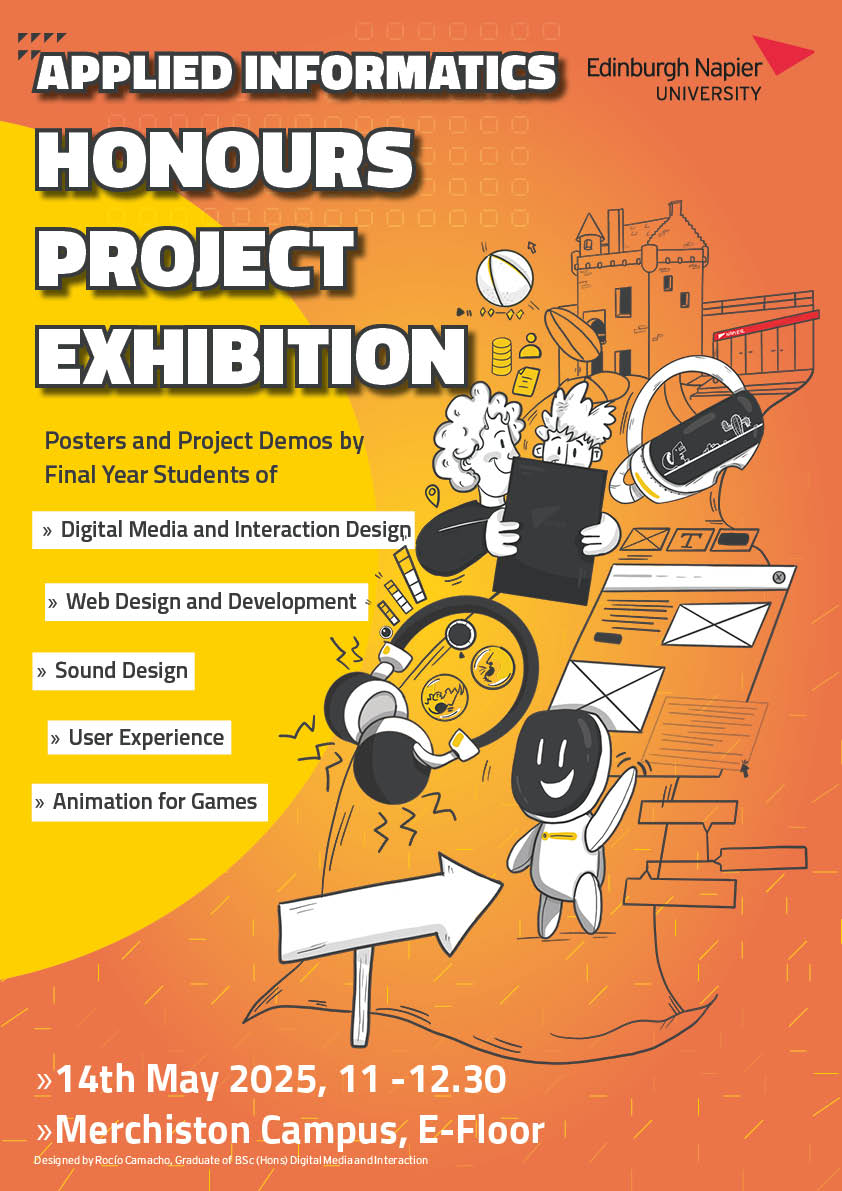 Our year 4 students are putting the finishing touches to their Honours Projects ready to share them at the exhibition on the 14th May. Please drop in to Merchiston Campus between 11 and 12.30 to meet the students and see a huge range of projects. We’ll also be sharing their work here over the next few weeks.