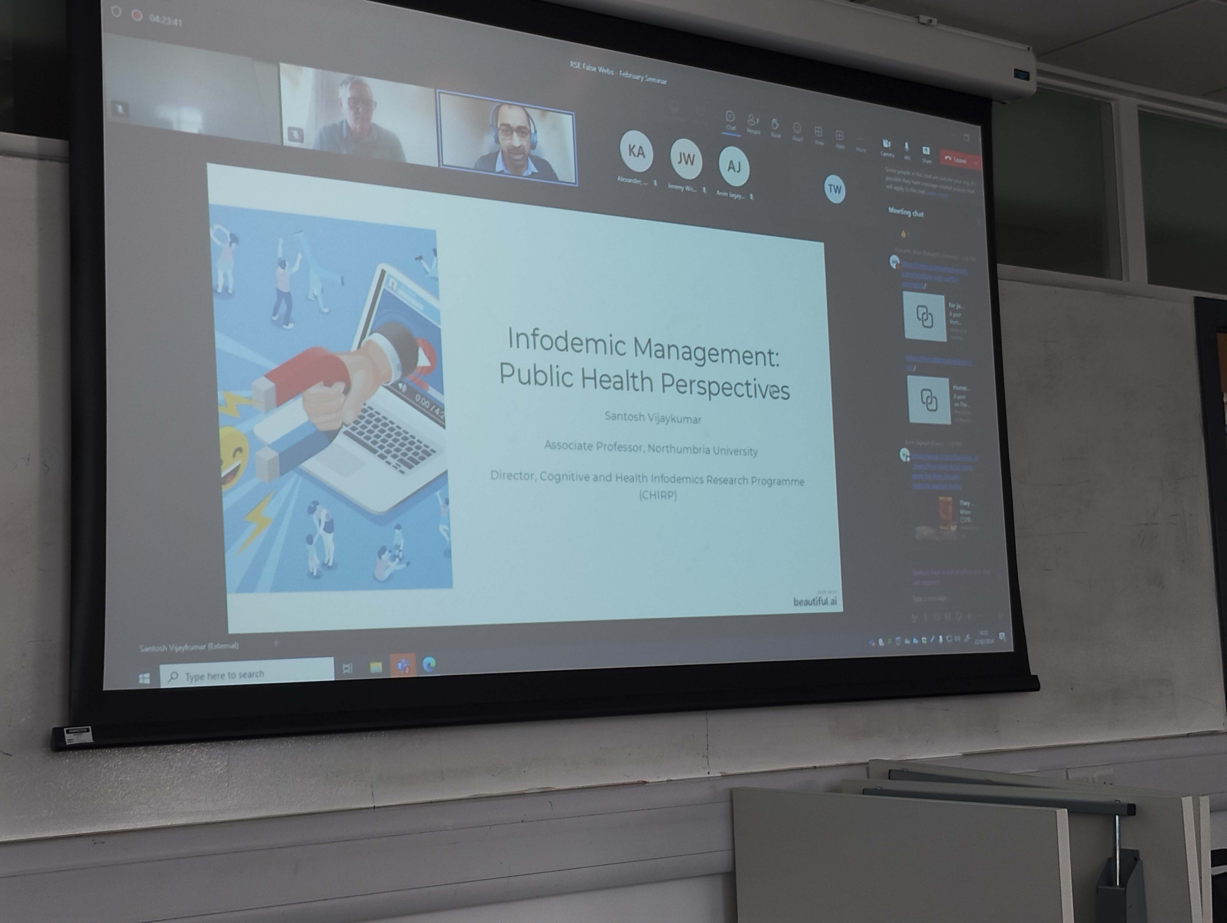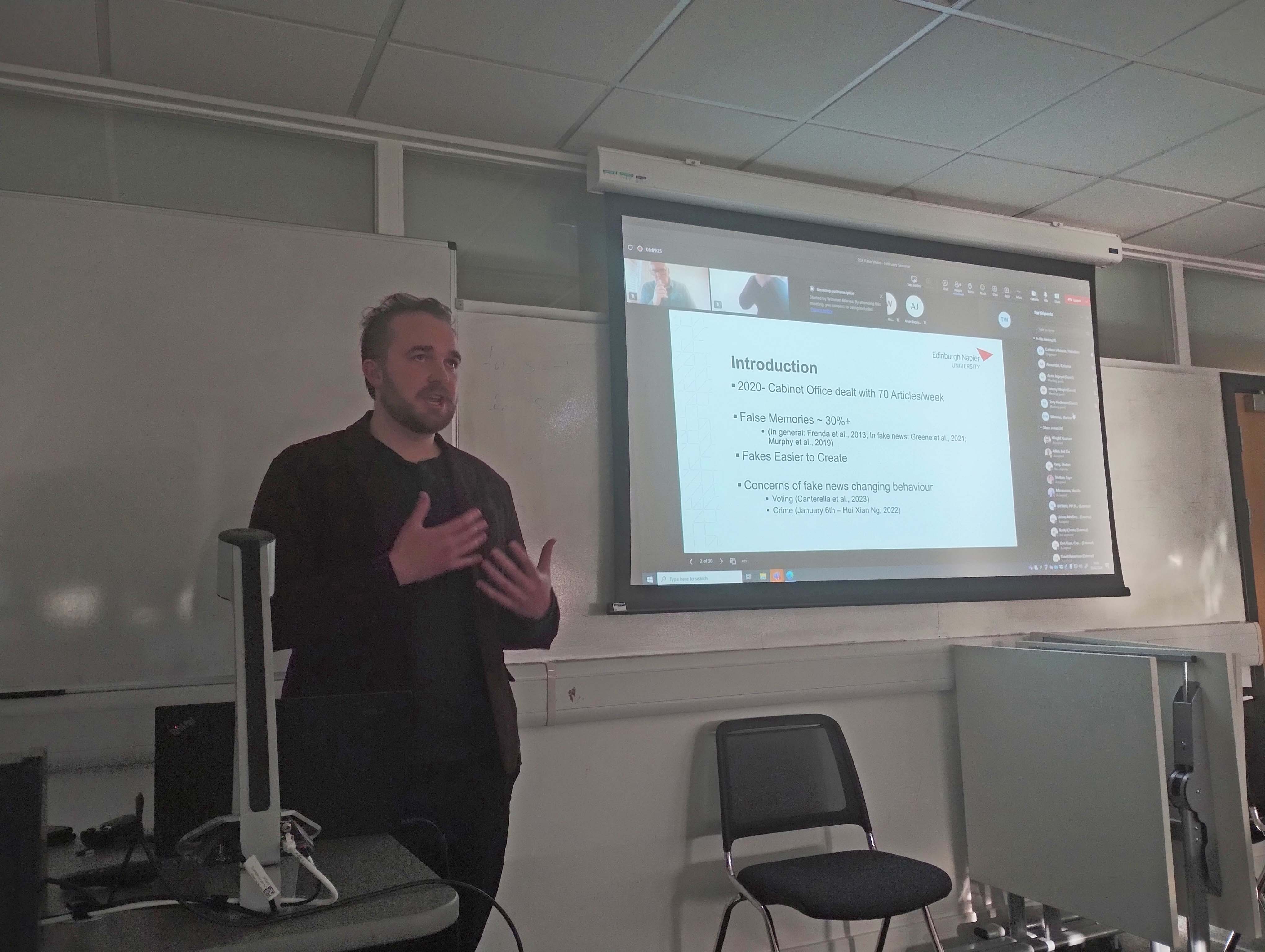 The first network seminar took place Friday, 23 February at Edinburgh Napier Merchiston Campus. This seminar was focused on fake news spreading, detecting, and fact-checking in humans, with talks from Graham Wright, Alice Howarth, Ariana Modirrousta–Galian, Ted Carlson Webster, Henry Otgaar, Chantal den Daas, Stephan Lewandowsky (Online), Santosh Vijaykumar (Online), and Natalia Pasternak (Online).