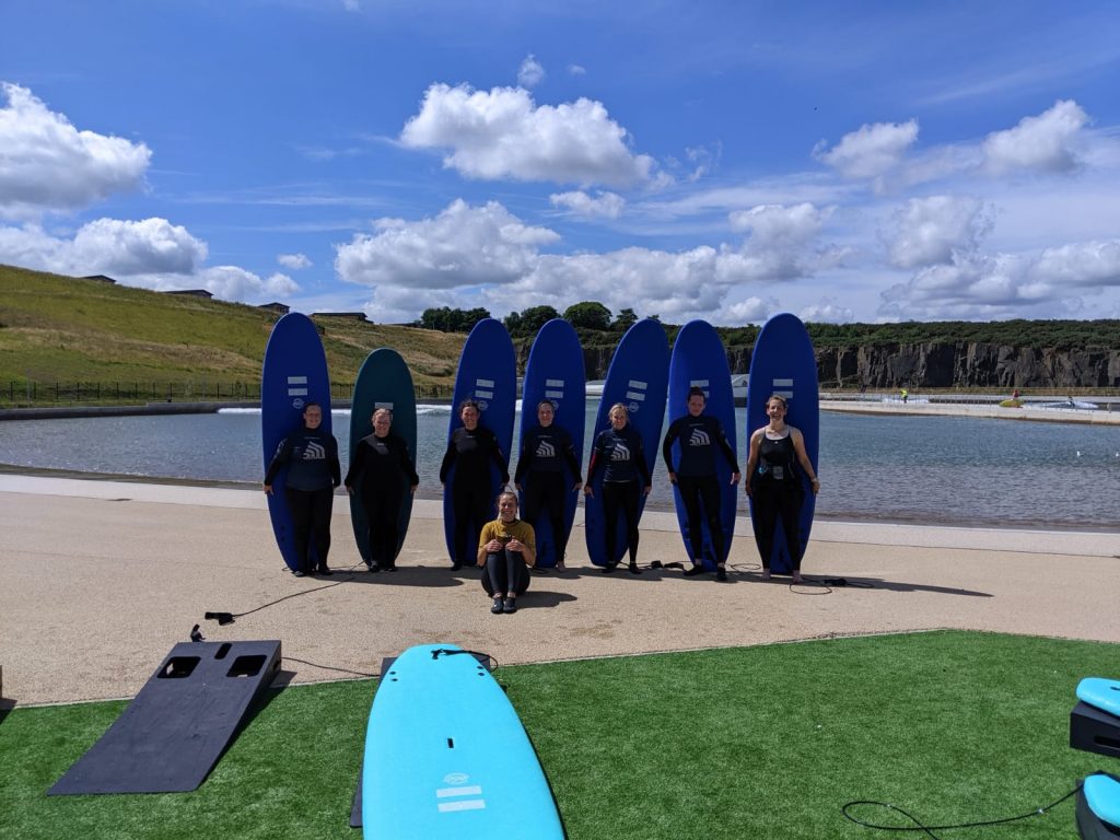 The surfing workshop took place at the Lost Shore Surf Resort in Ratho, using both the Edinburgh Napier Surf Lab and wave pool.